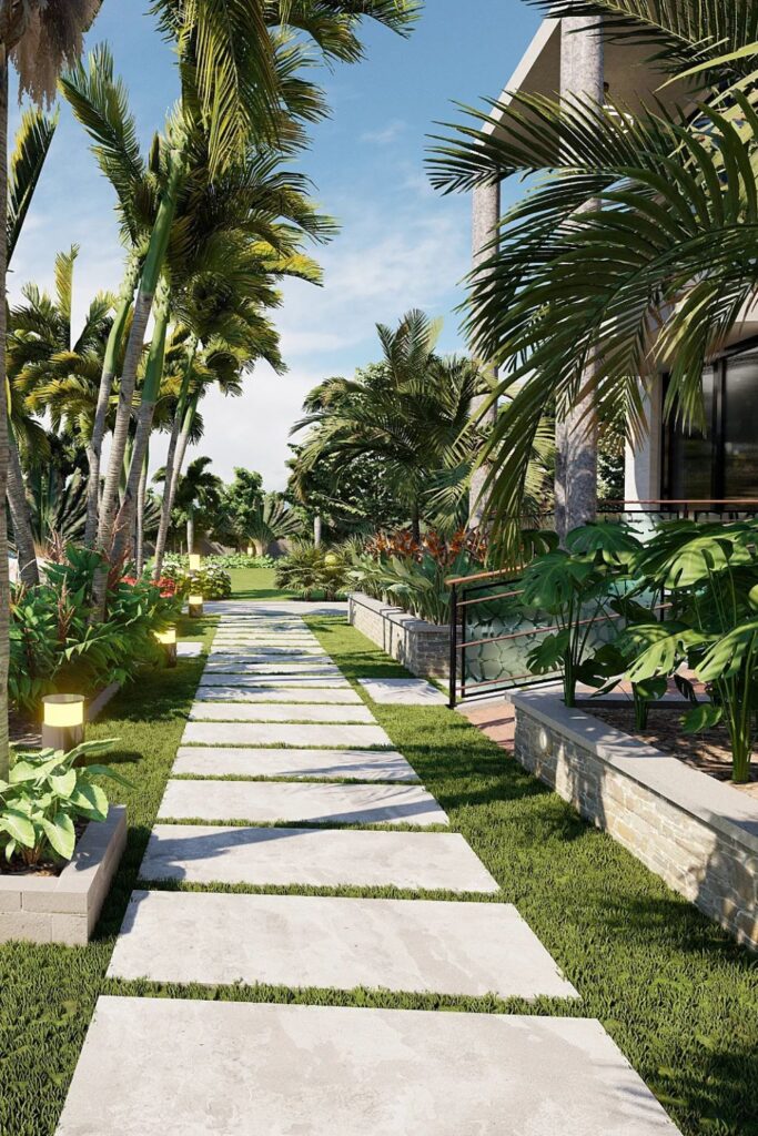 Frame the walkway with tall palms or bold tropical plants for shade and a splash of color.
