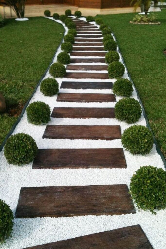 Create a stunning path with rich wooden slabs laid over bright white gravel.