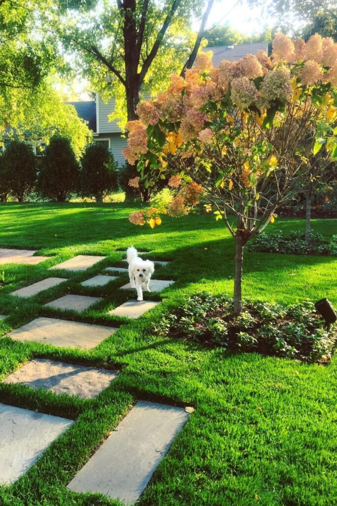 Bring a playful vibe to your yard with square stone pavers set into a lush green lawn.