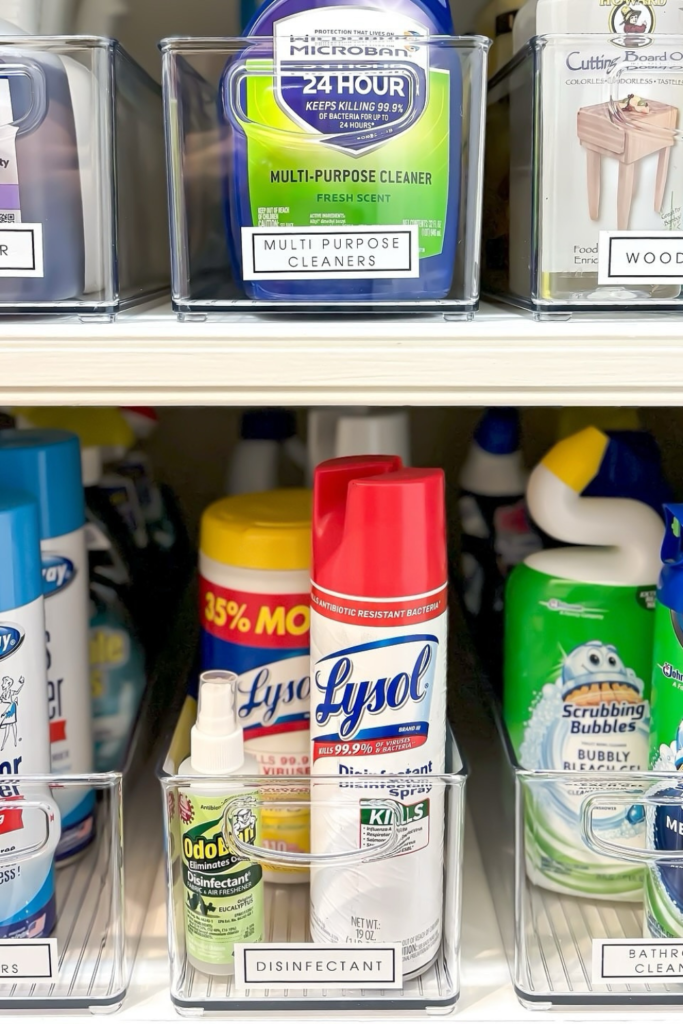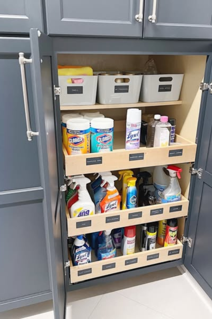 Visual order changes how fast you clean. Shelf-sized bins work best in closets or pantry-style cabinets, where products often stack unevenly.