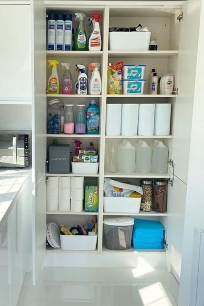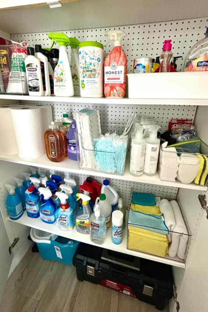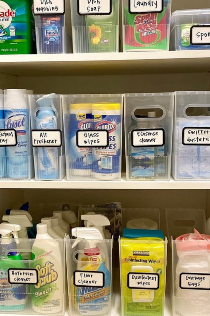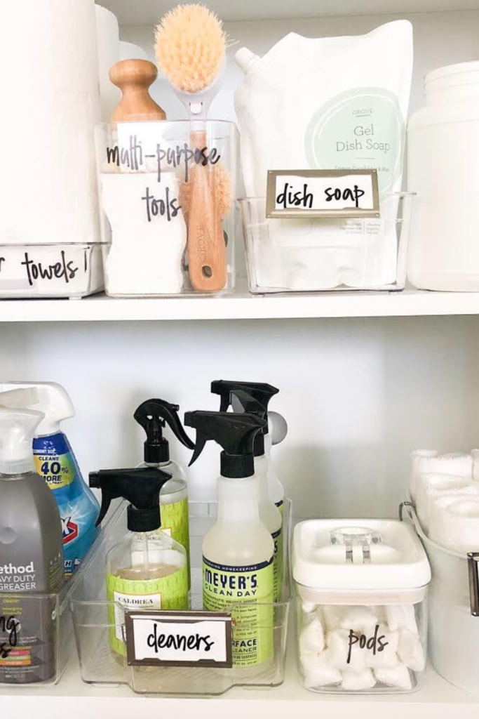 Group products by purpose cleaners, tools, refills and use clear containers so nothing gets lost in the back. Simple handwritten labels.