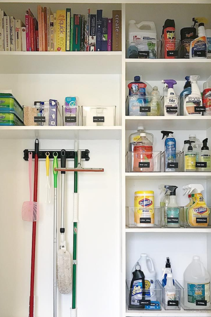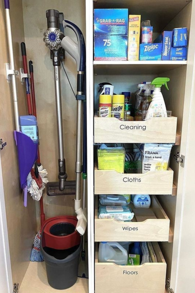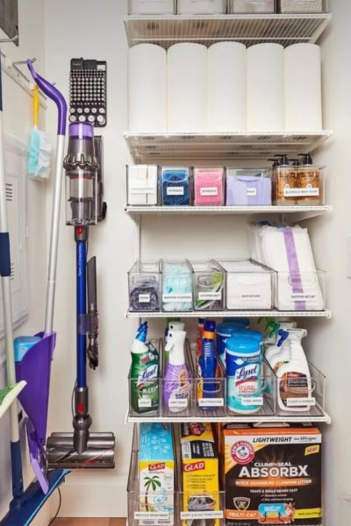 Clutter disappears when every item lives in a clearly labeled bin. This setup works best inside a cleaning closet.