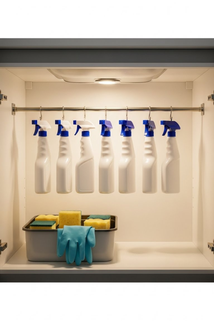 Crowded cabinets fill up quickly when bottles hang instead of being stacked. Install a metal bar under the sink and hang sprays by their triggers.