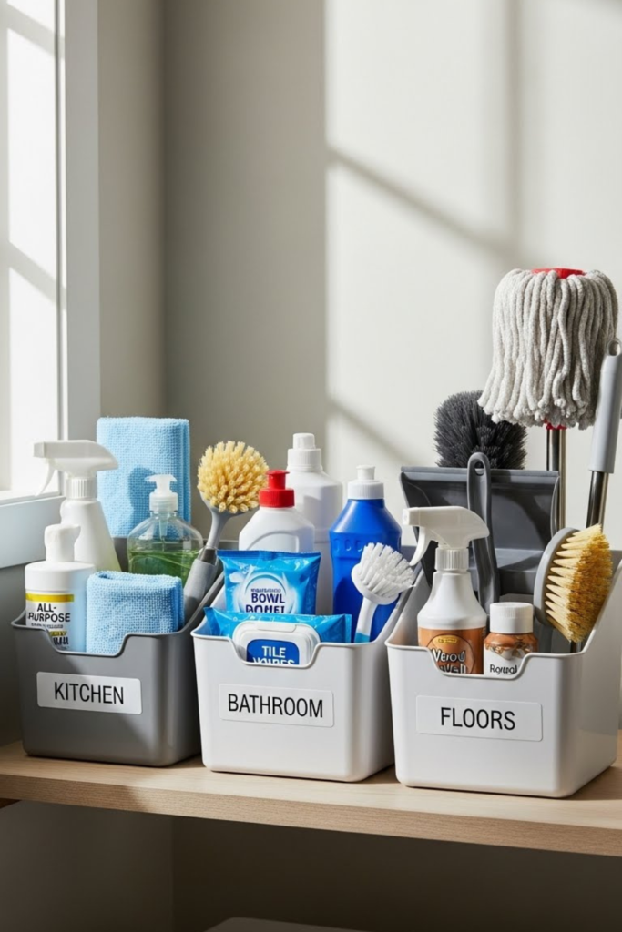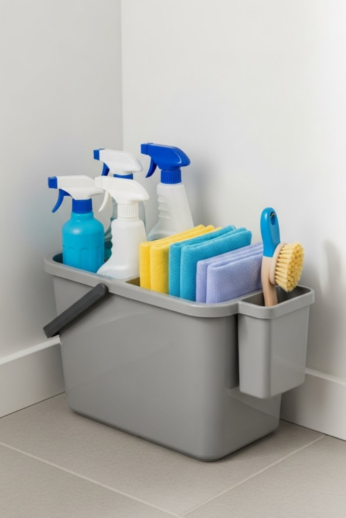 Room-based cleaning feels easier when supplies stay together. Build small caddies for bathrooms, kitchens, or floors.