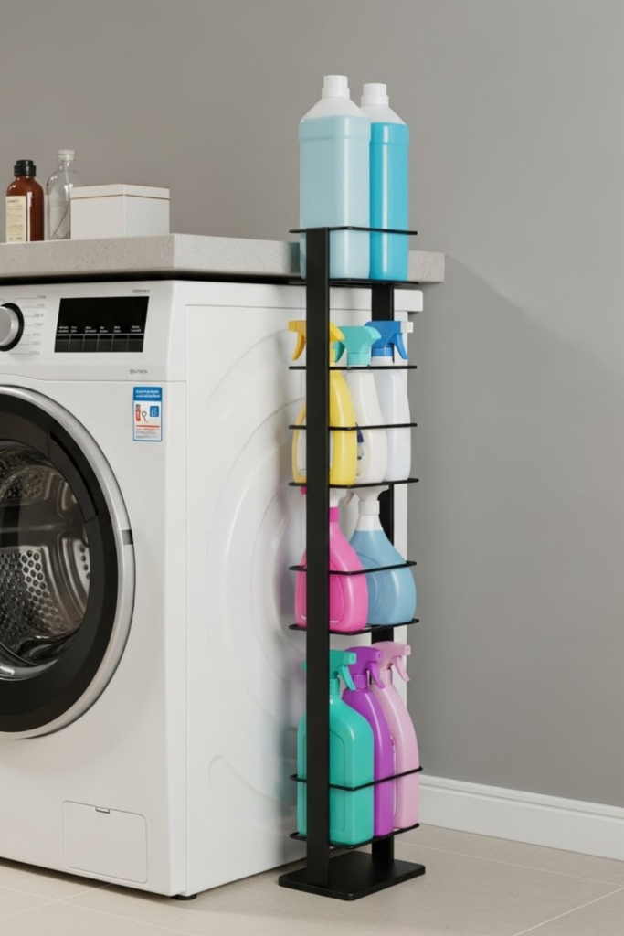 Narrow gaps near washers or fridges often go unused. Slide in a slim floor caddy to hold tall sprays and refills upright.