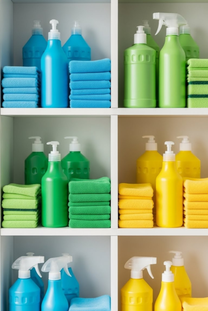 When you group supplies by use, store them where you actually clean, and keep everything visible and easy to reach.