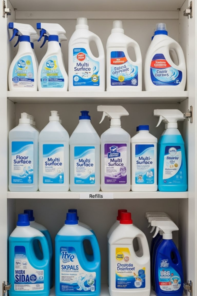 Most homes don’t need dozens of cleaners to stay clean. Keeping too many products creates clutter and makes organizing harder.