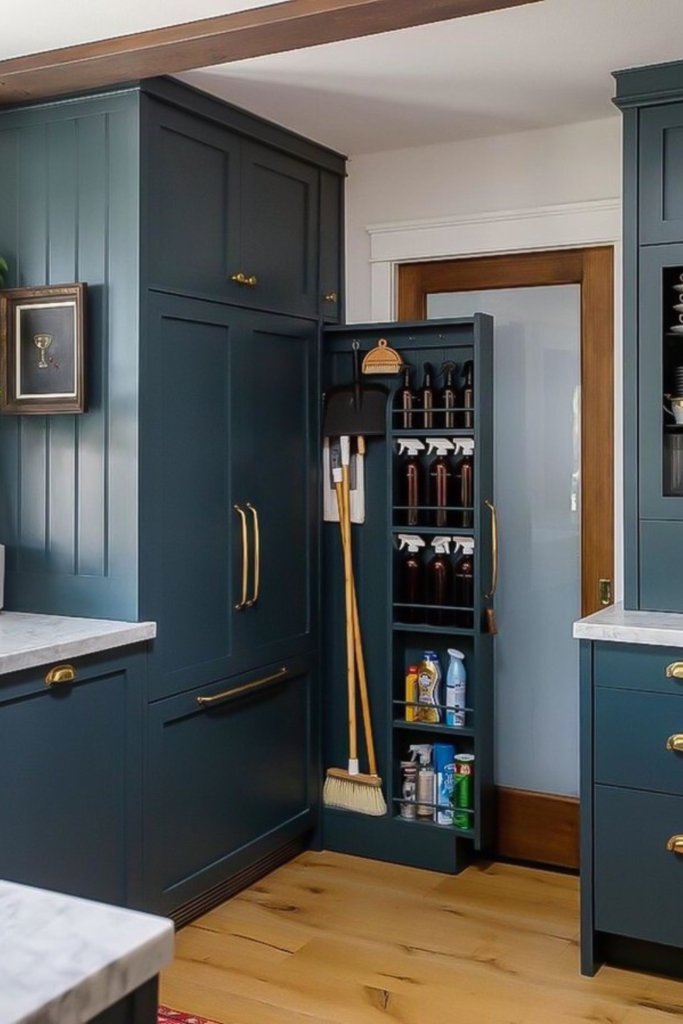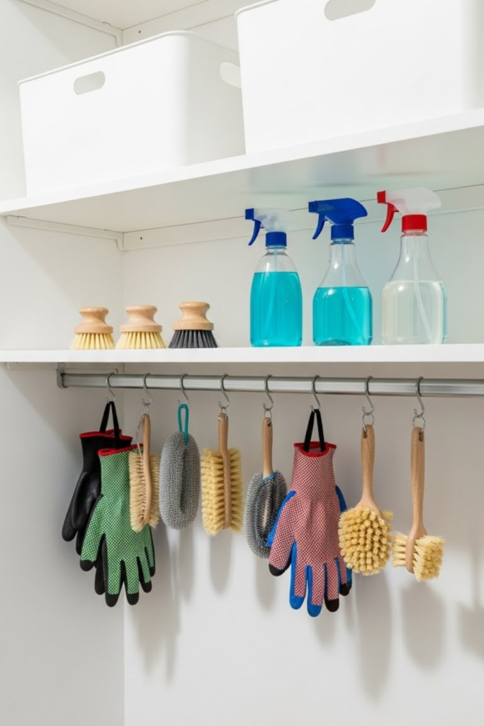 Install hooks for brooms and mops, add slim bins for refills and attachments. Vertical placement keeps tools off the floor.