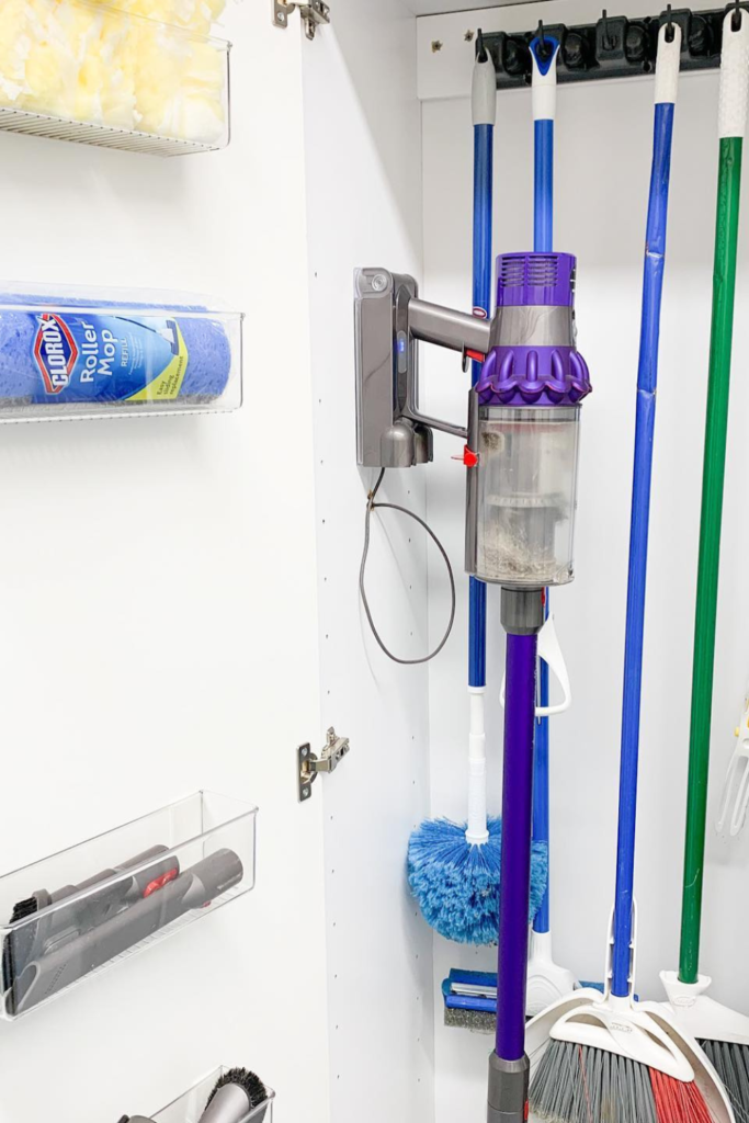 Tall tools take over fast when they lean or stack. A wall-mounted rack keeps everything upright and easy to grab, in narrow closets.
