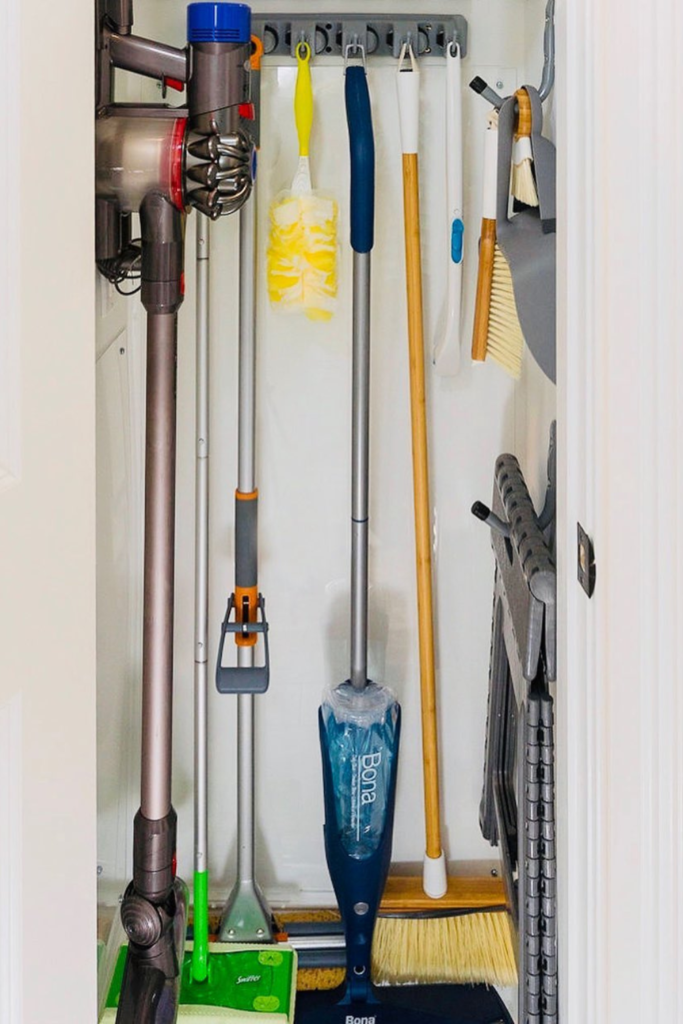 Hang mops, brooms, and dusters vertically so each tool stays separate and dries properly. Pair the setup.
