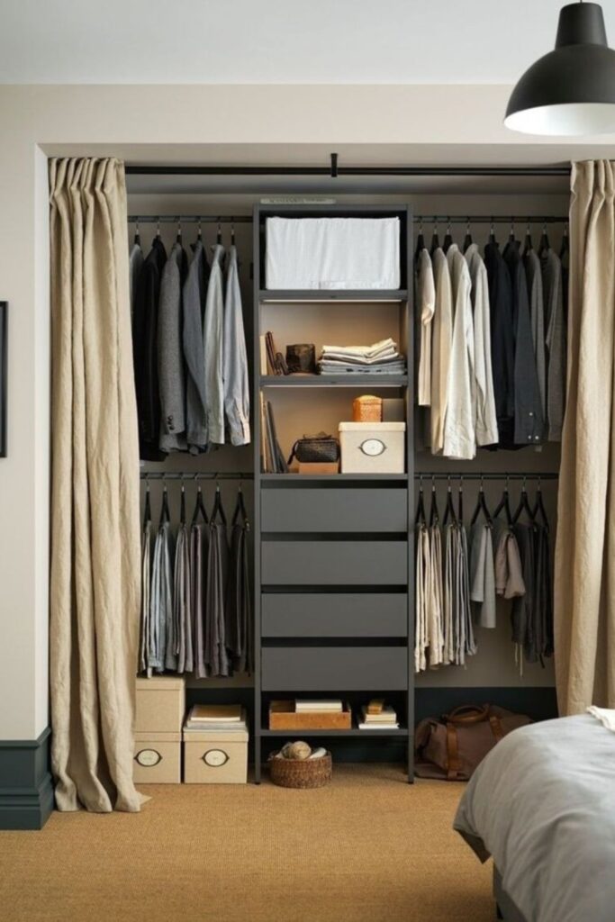 Within reach without making the hanging space messy. If doors feel heavy or take up too much space, curtains on both sides work well.