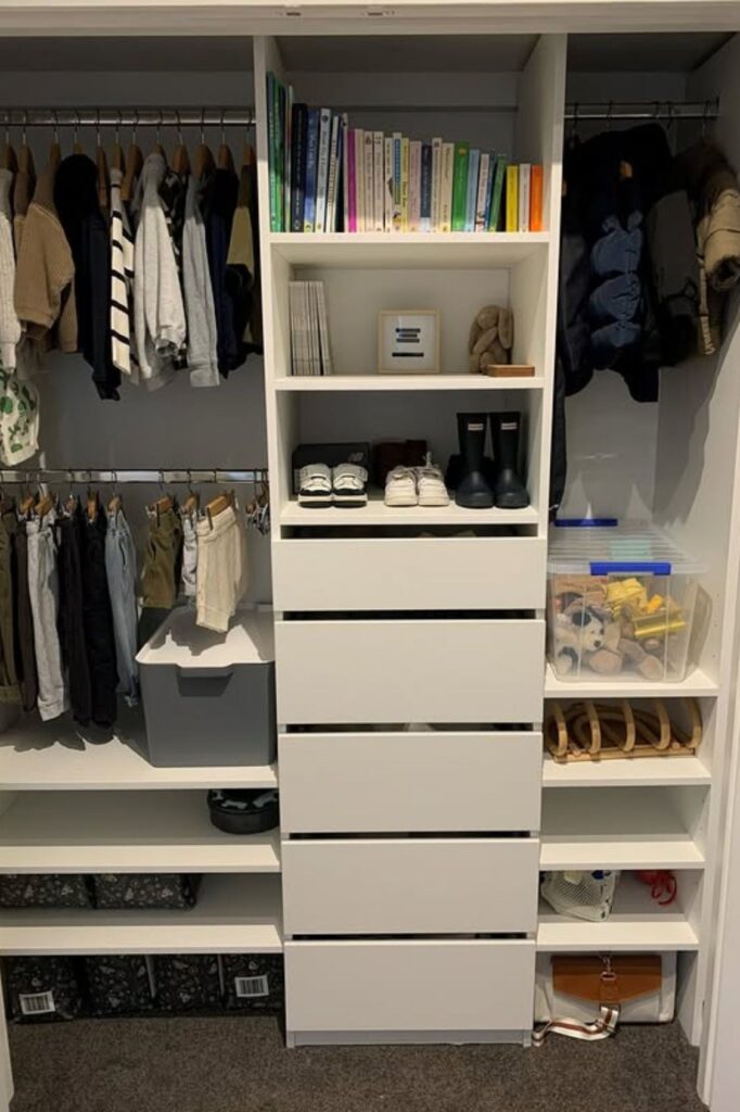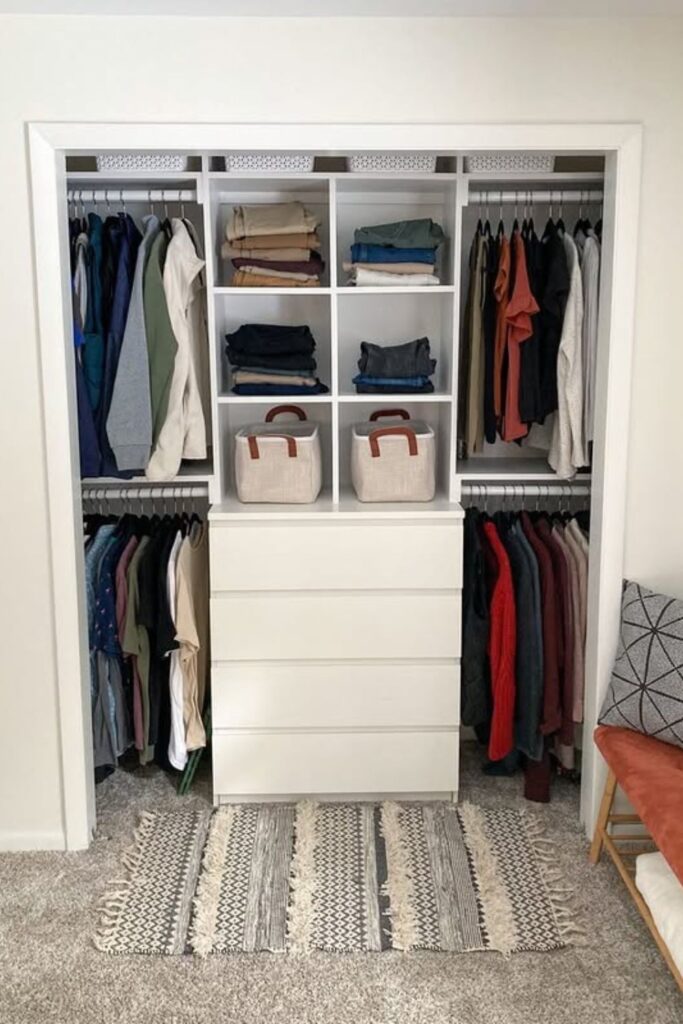 Closets feel crowded when folded clothes compete with hanging items for space. Adding a drawer unit in the center.