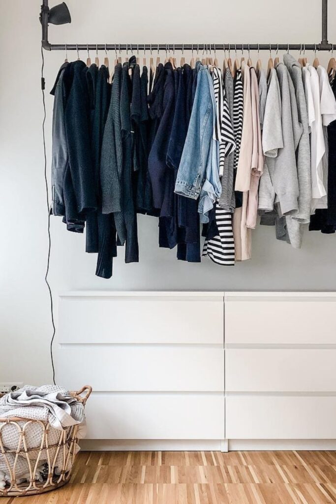 An empty wall can do the same role as a closet area, therefore you don’t always need one. Putting a single rod above a low dresser.