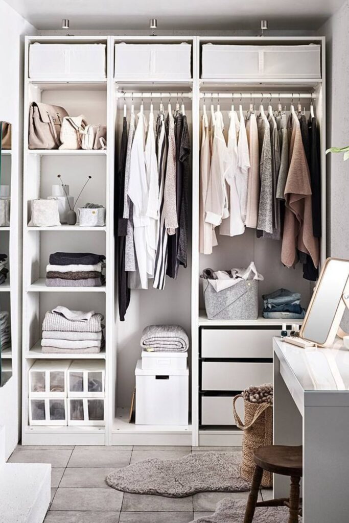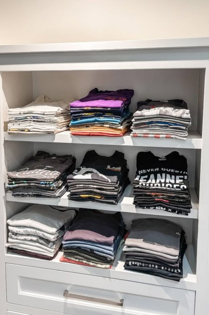 Use drawers for t-shirts, jeans, or other little things that don’t need to be on hangers. Open cubbies.
