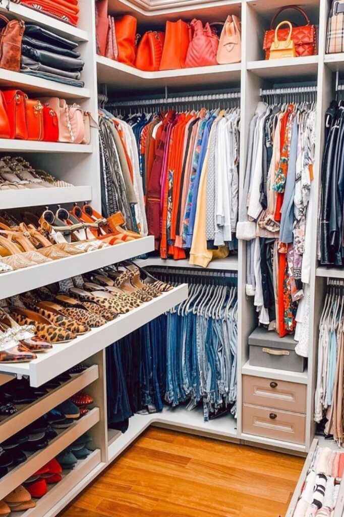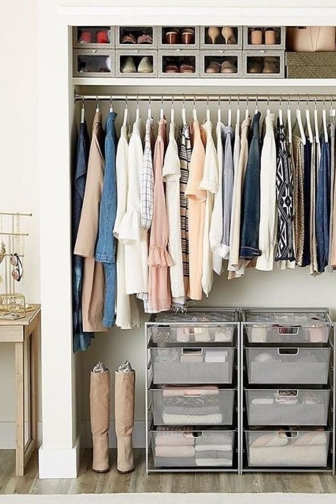Put things you don’t wear regularly on shelves or in storage bins on top. Putting shoes and other little things to the bottom of the closet keeps it clean and makes it easy to keep clean.
