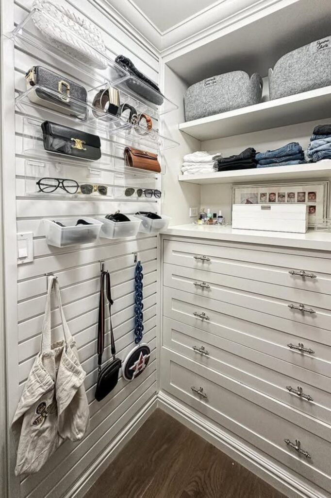 Accessories often get lost in drawers where you can’t see anything at once. Using wall-mounted panels.