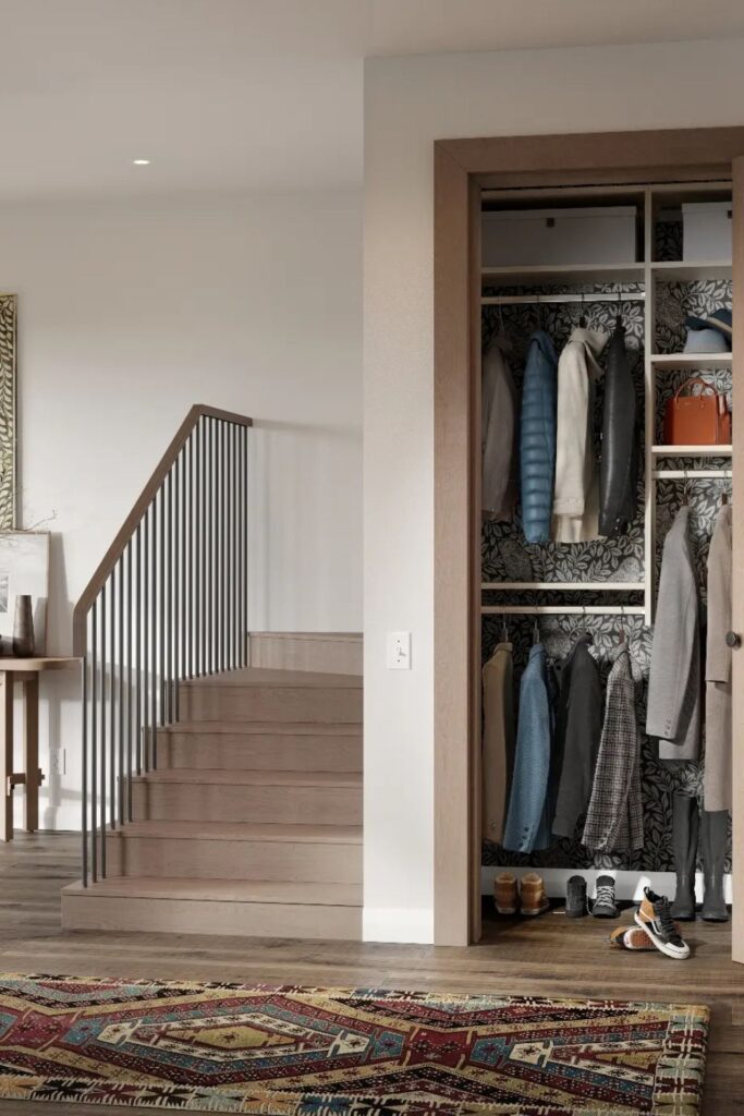 Narrow spaces near entryways often get ignored, even though they can store a surprising amount of clothing.