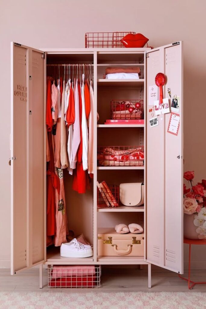 Small rooms don’t always have space for a full wardrobe, but a narrow locker-style cabinet can still handle a lot more than it looks.