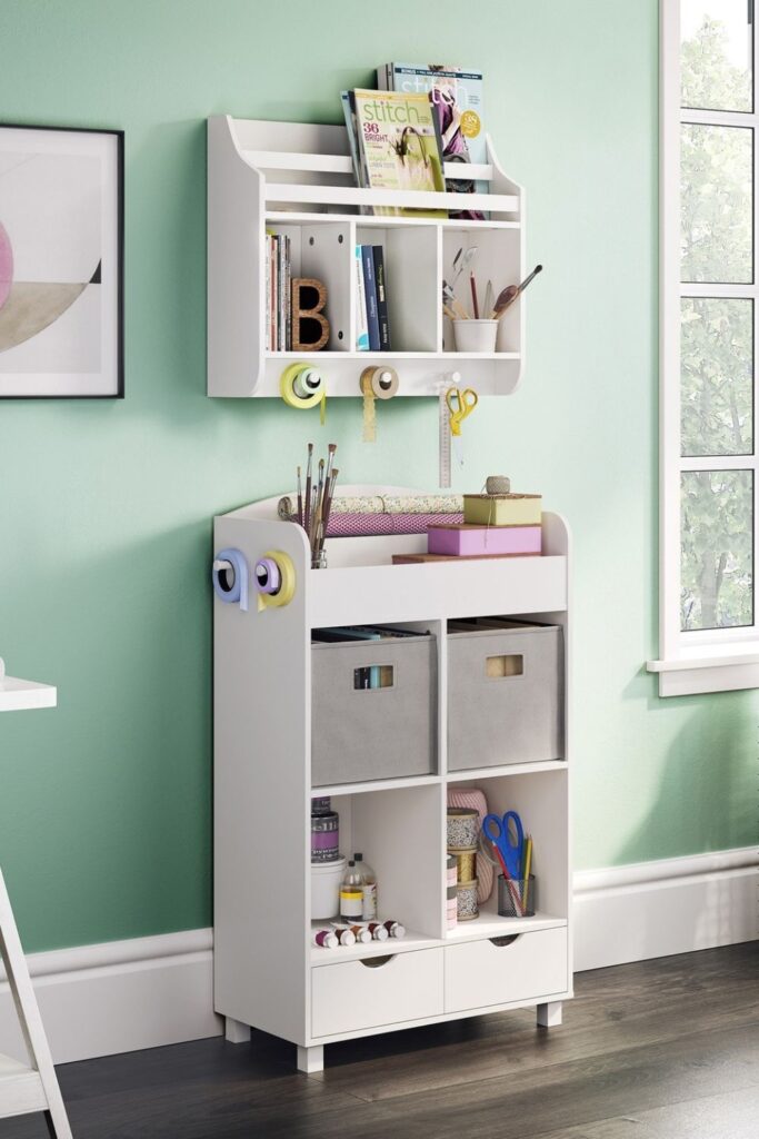 A wall-mounted rack holds notebooks, magazines, and scissors, while the compact floor unit includes cubbies and drawers for ribbons, paints, fabrics, and other tools.