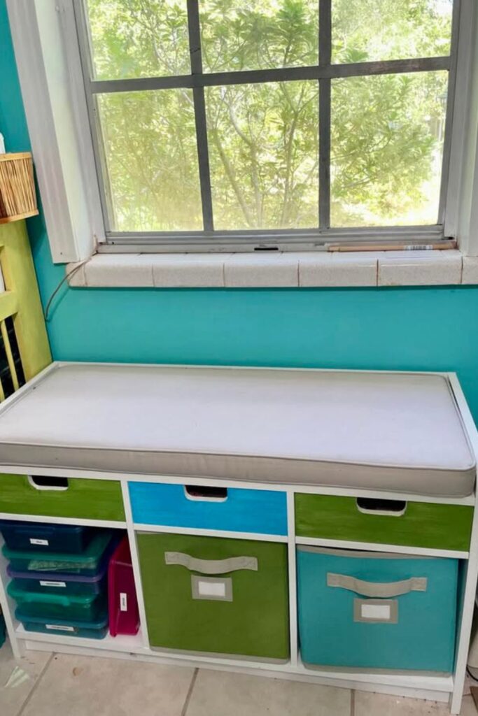 Topped with a cushioned bench, it offers a cozy seating area while hiding clutter.