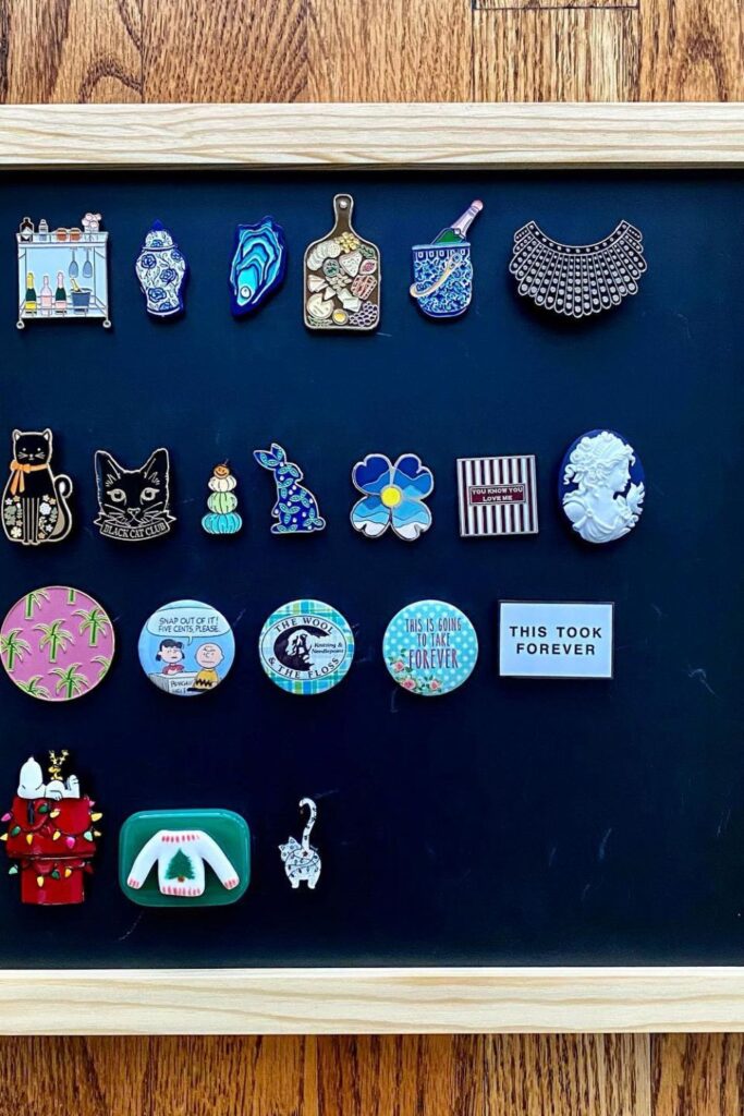 The contrast of a dark background lets enamel pins, badges, and brooches stand out, doubling as functional storage and wall art.