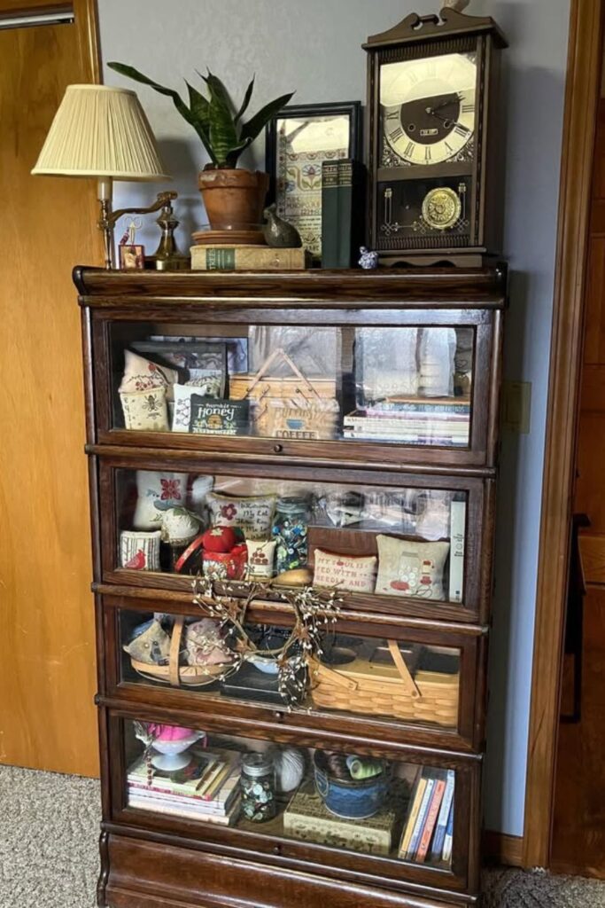 The warm wood tones and elegant design enhance any craft room, present stylish storage for cherished supplies and decor while maintaining a tidy, protected appearance.