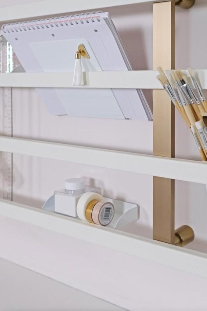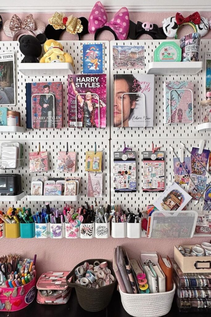 Use hooks, baskets, and mini shelves to organize everything from washi tape to pens and decor items.