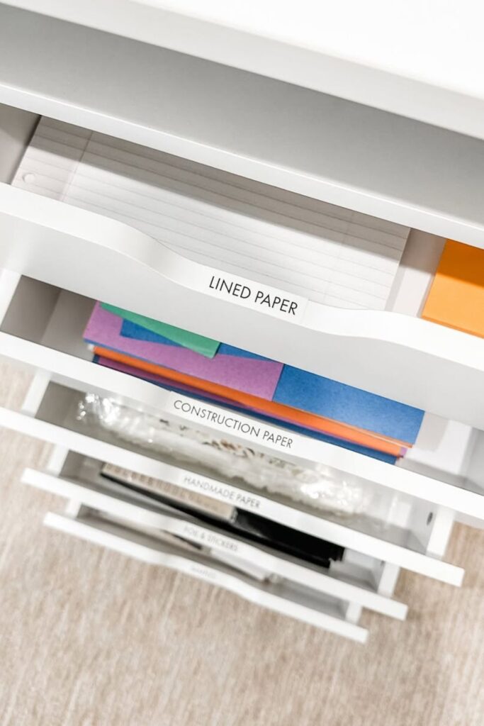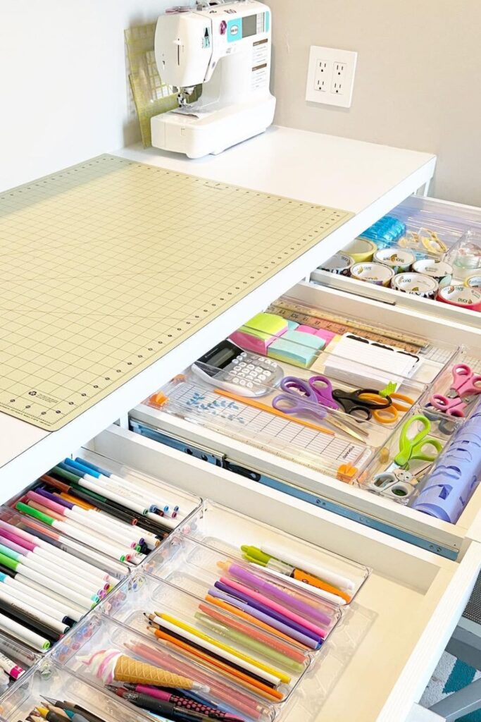 Store pens, rulers, scissors, and washi tape neatly within desk drawers.