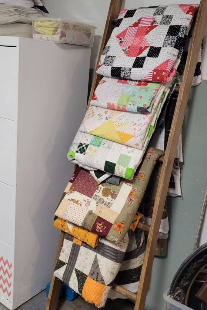 This clever solution elegantly leans against the wall, offering a stylish display for quilts or fabric projects.