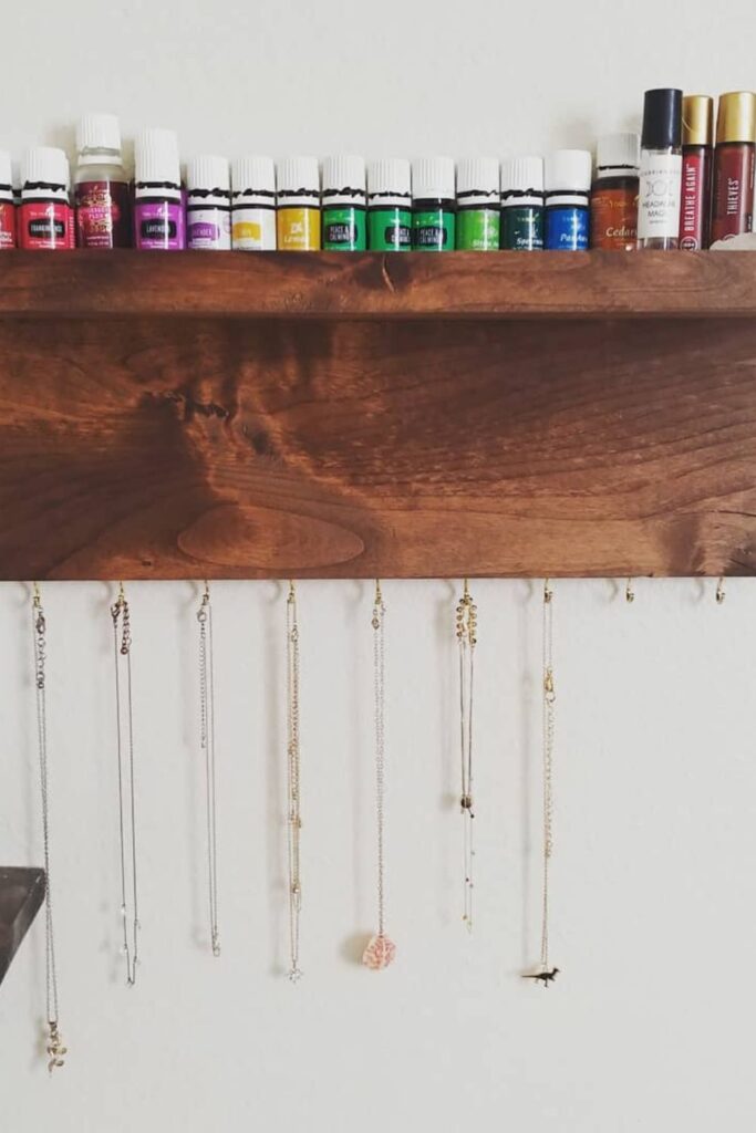 Use the top shelf for small paint jars or essential oils while the hooks below hold jewelry, charms, or hanging supplies like beads.