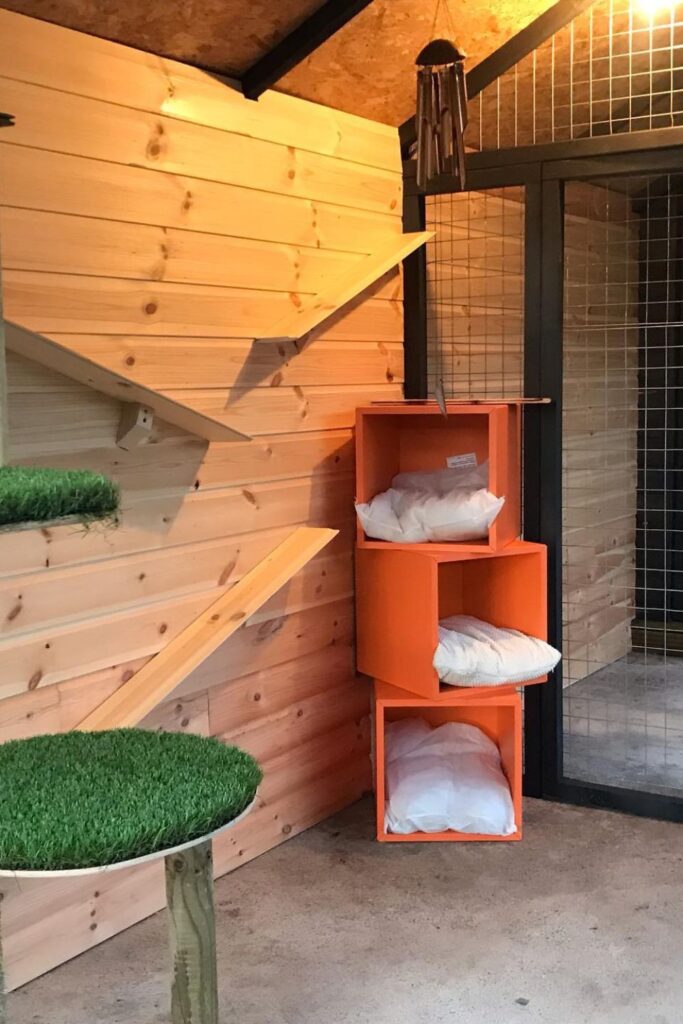 This arrangement is ideal for indoor cat rooms or covered patios. Cats are drawn to vertical space, but they also sheltered place to relax and feel safe.