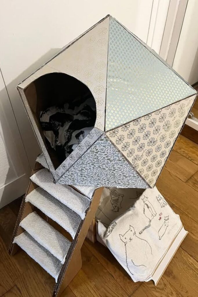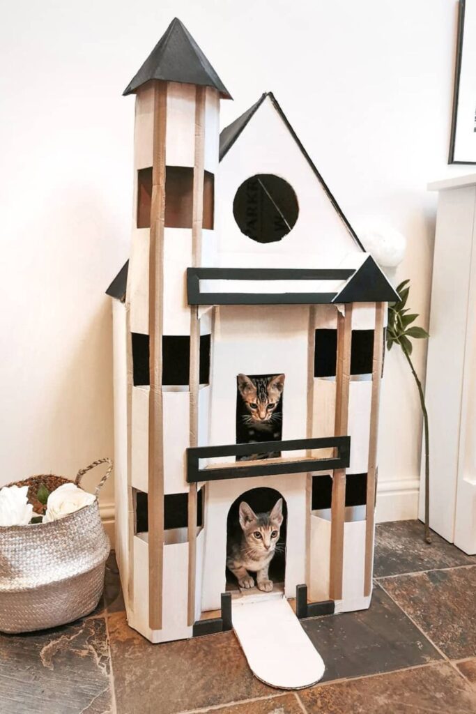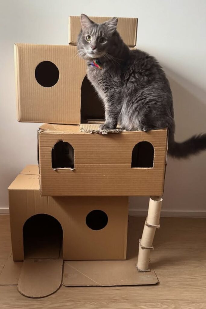Transform simple cardboard boxes into lively play and rest zone that captivates cats on multiple levels.