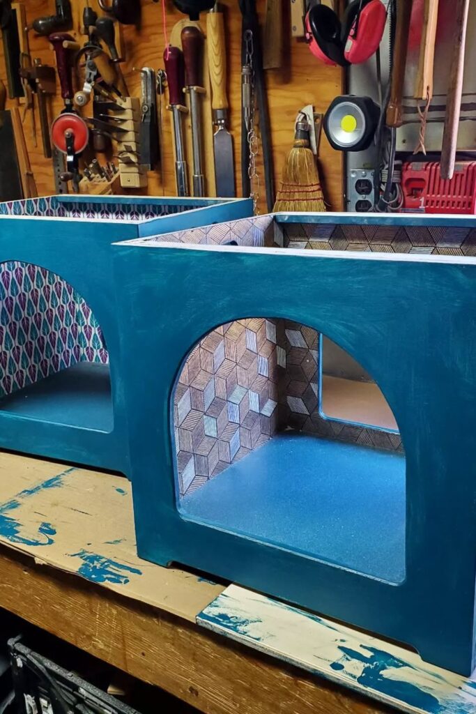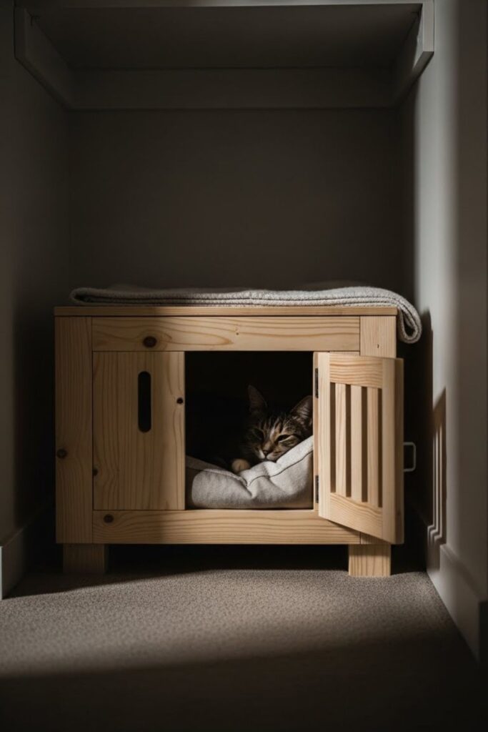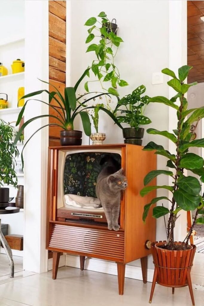 Old furniture can solve the cat house problem without adding clutter. A vintage TV cabinet or side table already has the perfect enclosed shape cats love.