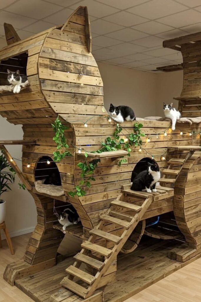Serious climbers need more than a box on the floor. Pallet wood turns into a full cat zone with ramps, ledges.