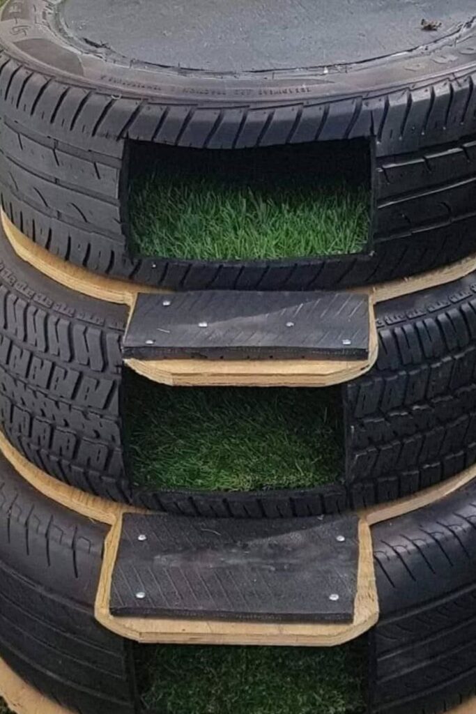 Old car tires handle rain, cold, and rough weather better than most DIY materials. Stack cleaned tires, cut a wide front opening.