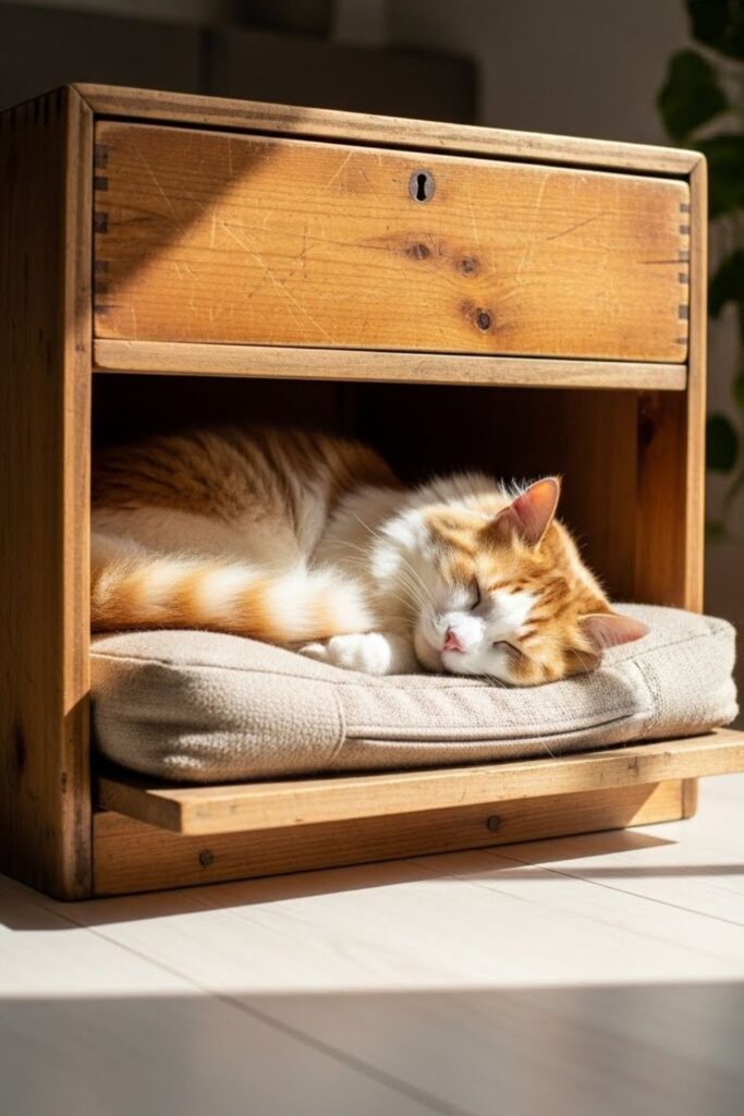 Old dresser drawers solve two problems at once storage waste and cat comfort. Remove the drawer, flip it on its side, and secure the base so it doesn’t slide.