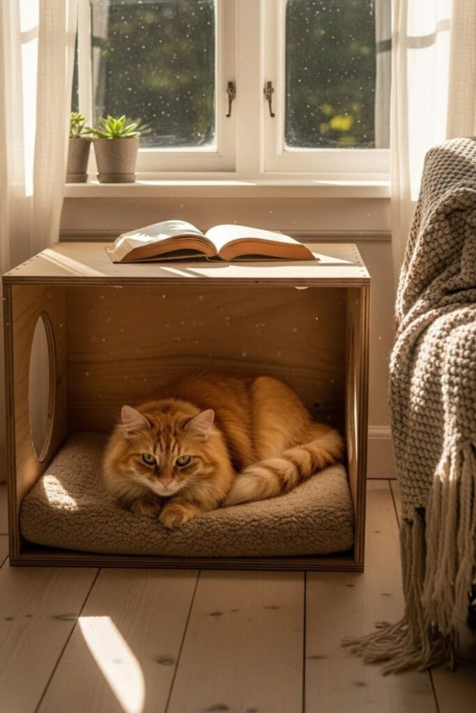 Sunlight works wonders for a cat. A basic wooden or cardboard box, strategically placed under a window, provides a kitty with a perfect combination: warmth, a vantage point, and a cozy hideaway.