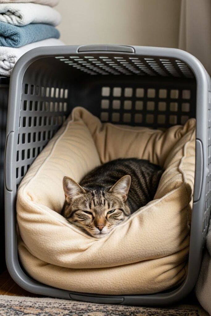 Laundry baskets already smell familiar, which helps cats settle faster. Flip a sturdy basket on its side, secure it so it won’t roll, and line the inside with thick fabric.