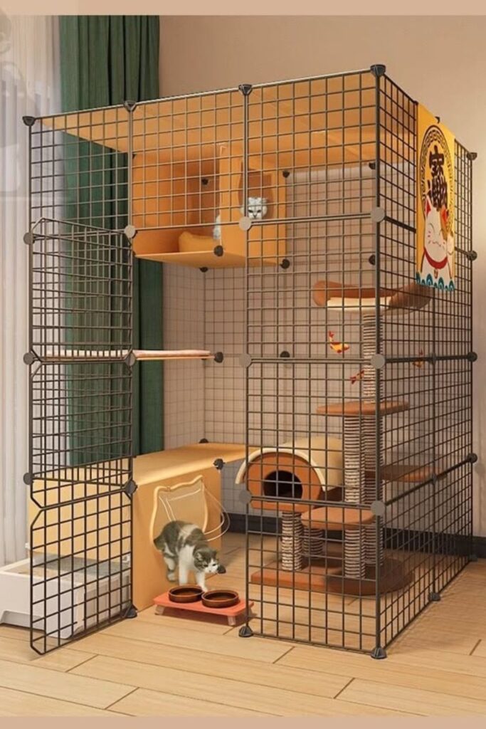 Limited floor space doesn’t mean boring cat housing. Wire storage panels snap together into a tall, flexible structure that fits corners and small rooms.