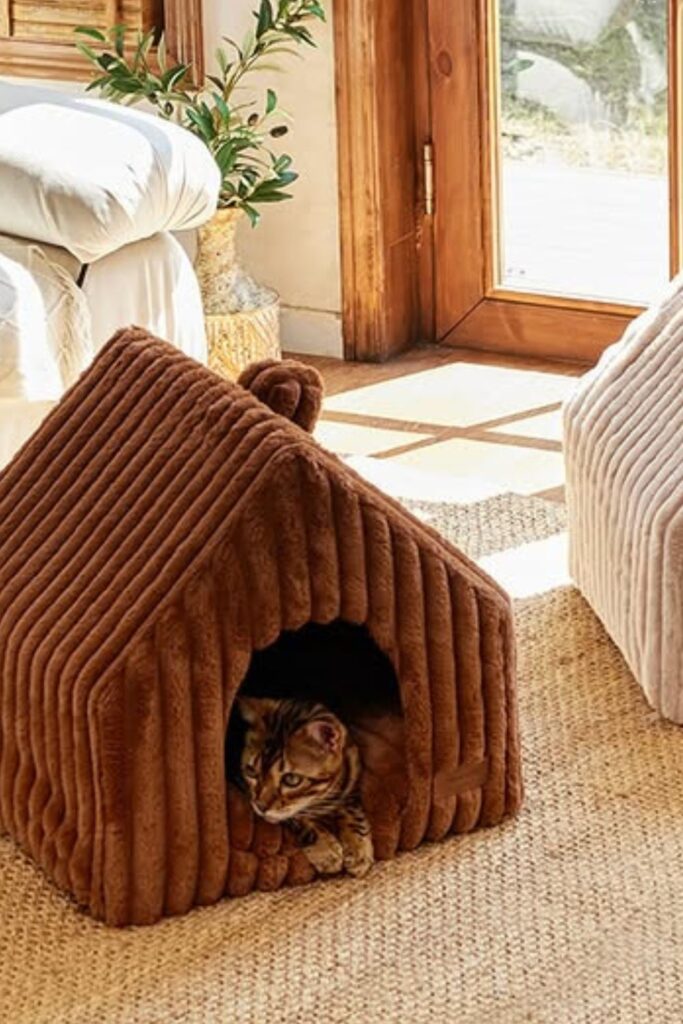 Soft walls provide the soothing environment for cats that feel uncomfortable on hard surface. And a Fabric-covered foam houses are good choice for indoor use.