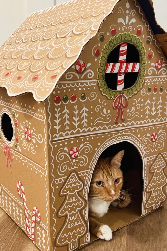 Holiday cardboard doesn’t have to end up in the trash. Painted boxes turn into a cozy seasonal hideout and feels fun without losing function.
