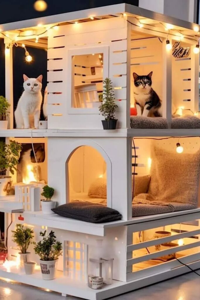Luxury doesn’t have to mean complicated. Stacked wooden crates create separate rooms cats naturally claim as their own.