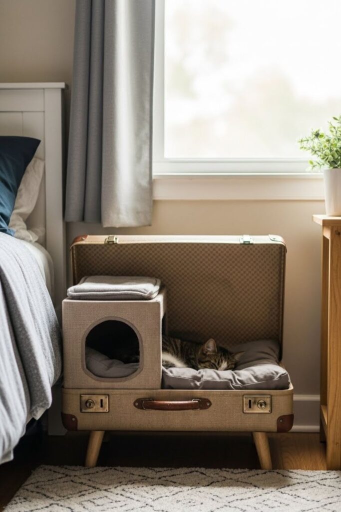 Raising the suitcase and a bit off the ground makes cats feel more secure and keeps things tidy, all without altering the overall look.