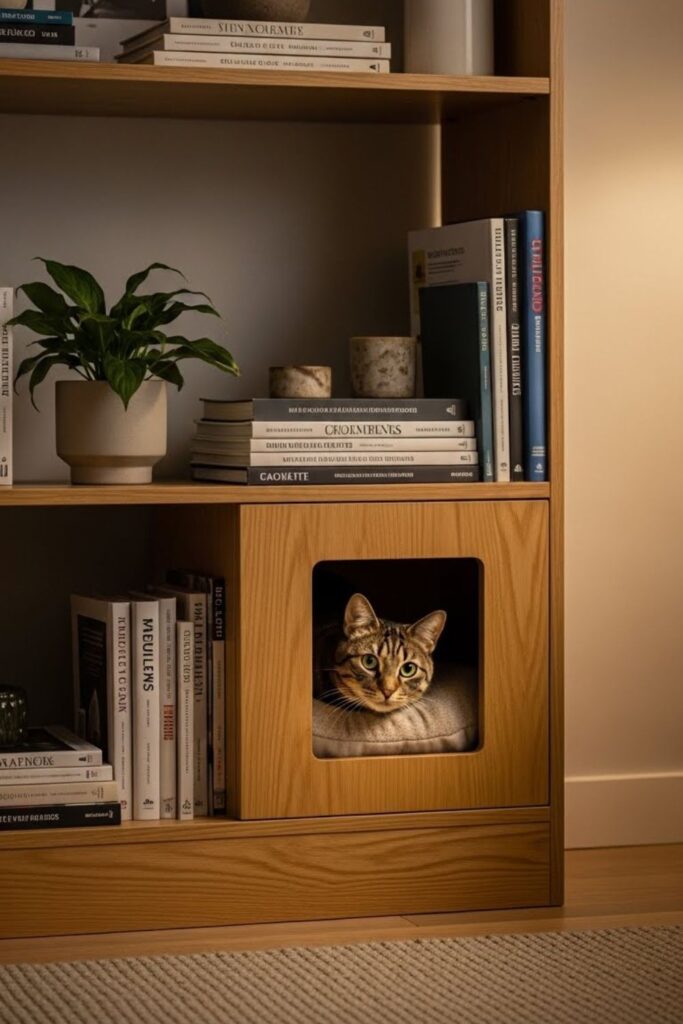Empty shelves can do more than hold books. Sliding a box or wood frame into a lower bookshelf slot creates a hidden cat house that blends in.