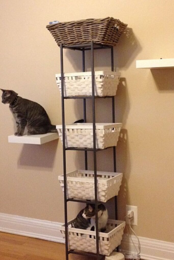 Cleverly arranged storage furniture can serve the a dual purpose: a cat tower. This kind of basket arrangement is ideal for the smaller spaces, especially when you’re short on floor area.