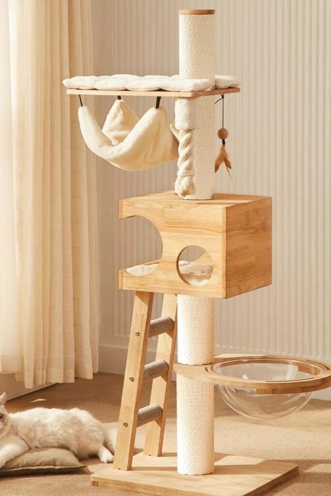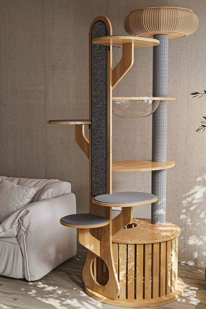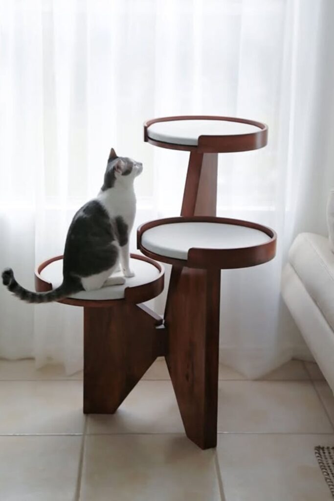 Curved wood, a blend of textures, A cushioned platform can transform a cat tower from a mere object into a design element.