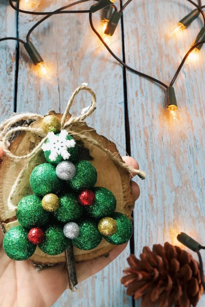 Adhere tiny green glitter balls in the shape of a tree to a piece of wood. Place a tiny snowflake.