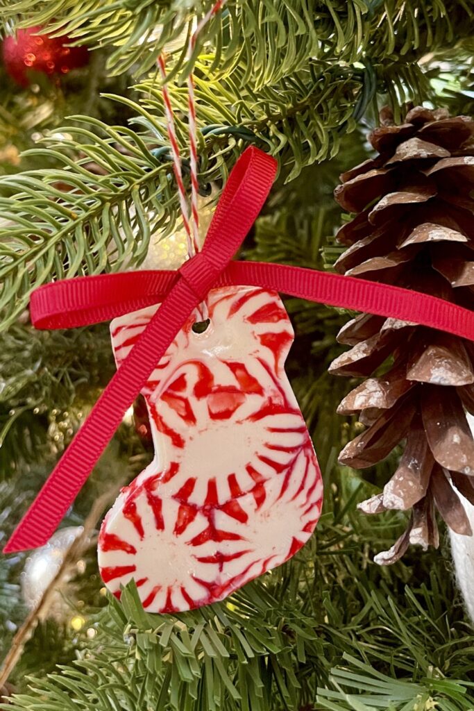 This peppermint stocking ornament gives your tree a vibrant, candy-store glow. Place the peppermint candies.