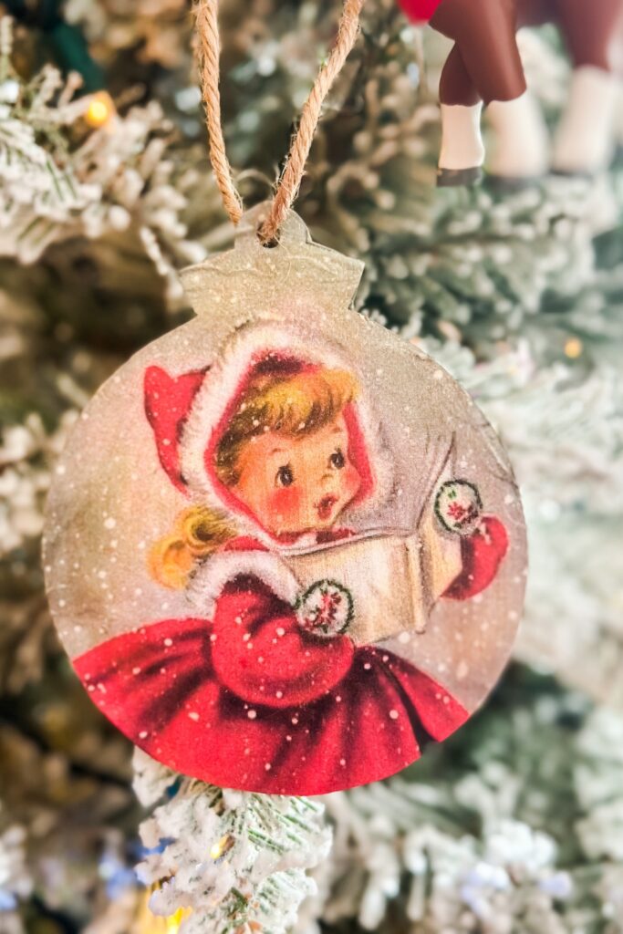 This ornament adds a touch of handmade nostalgic charm to your tree. Cut out an image from an old Christmas card .