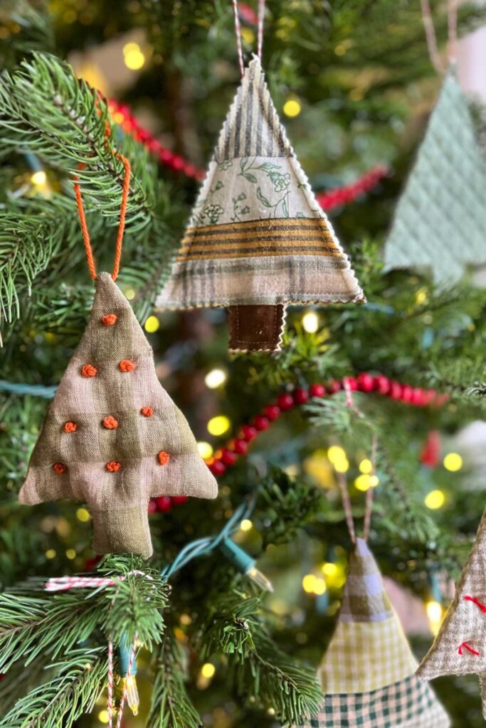 Lightly stuff them with cotton. Add tiny buttons or embroidered dots. They look great on warm, retro-style trees.